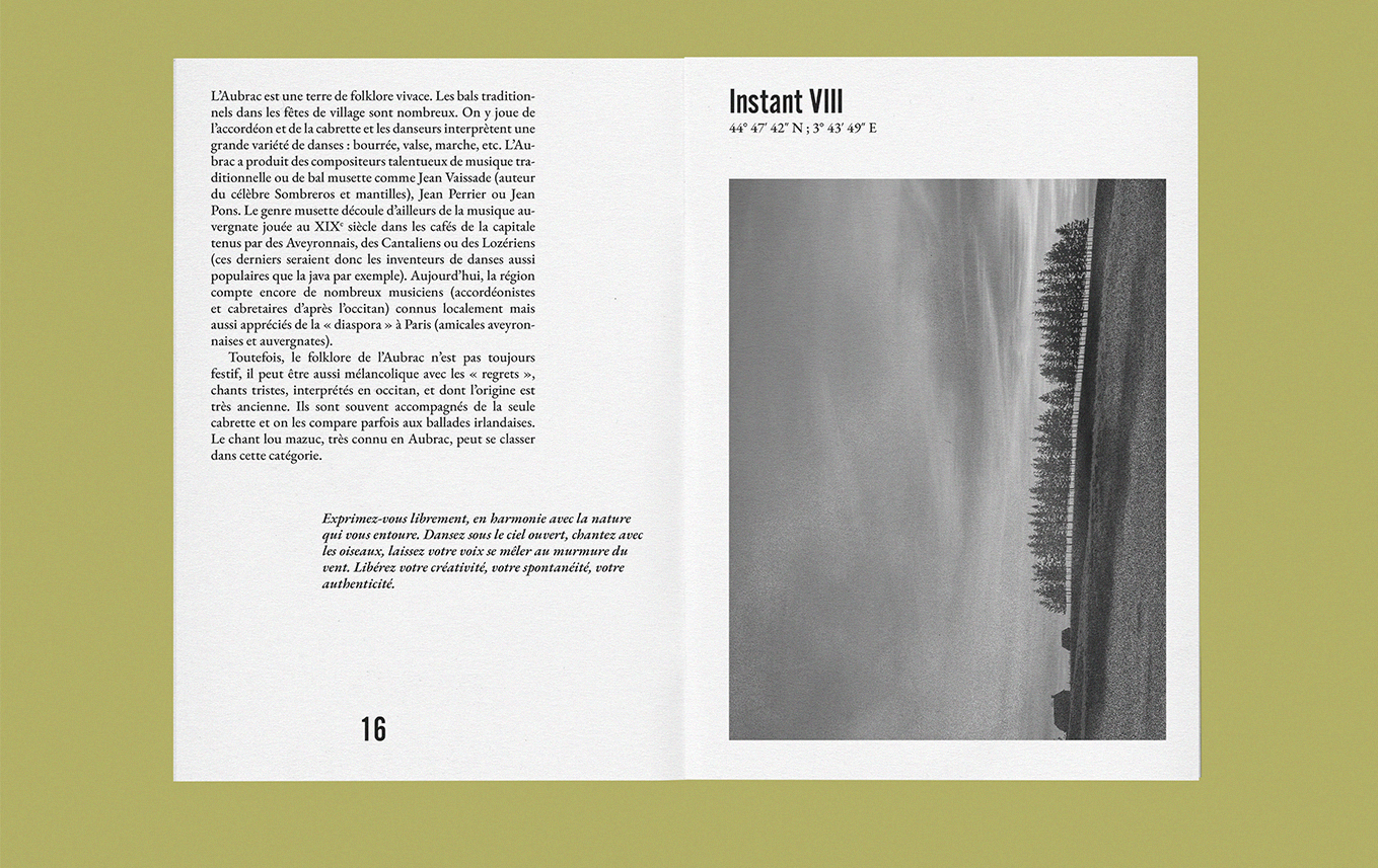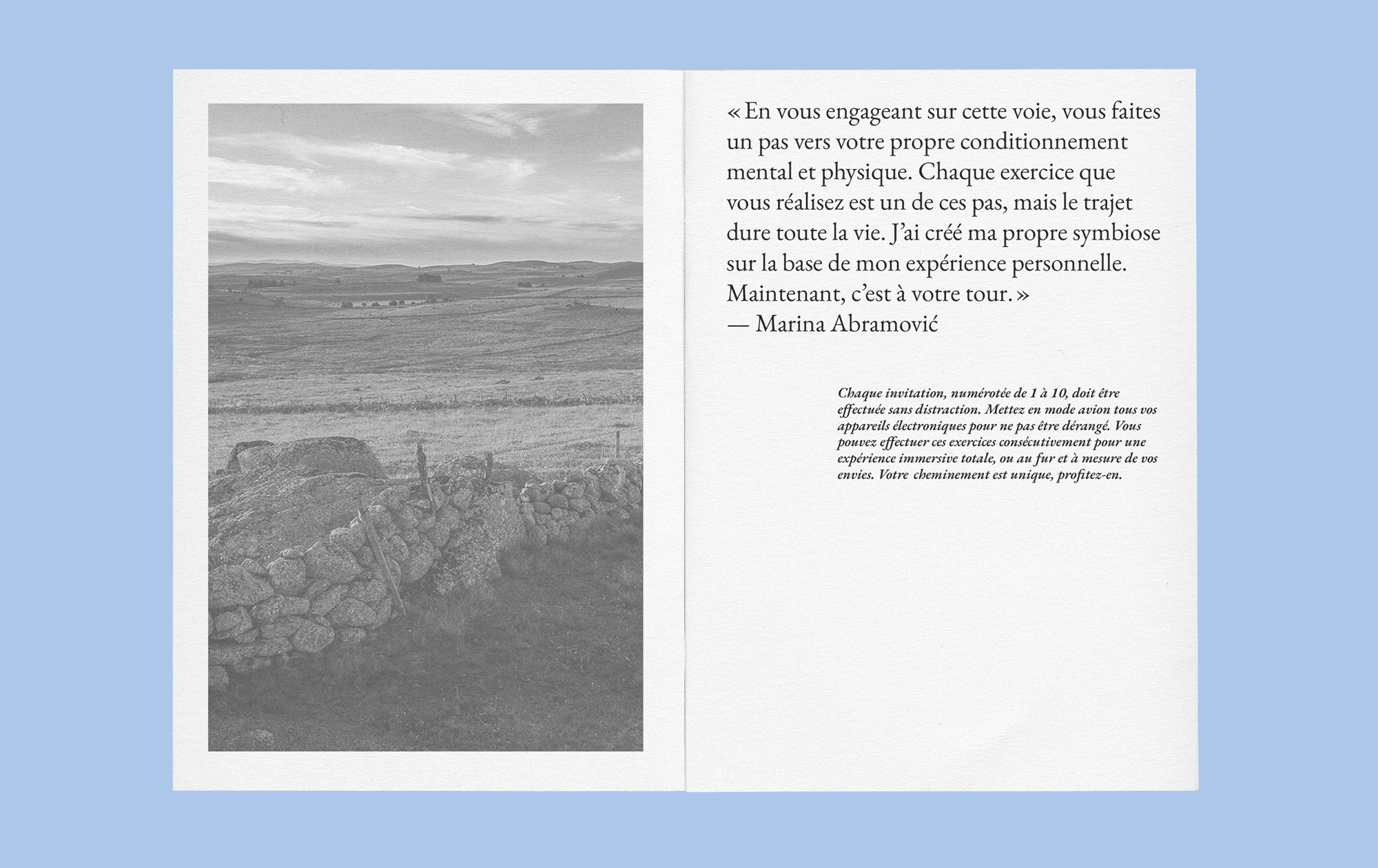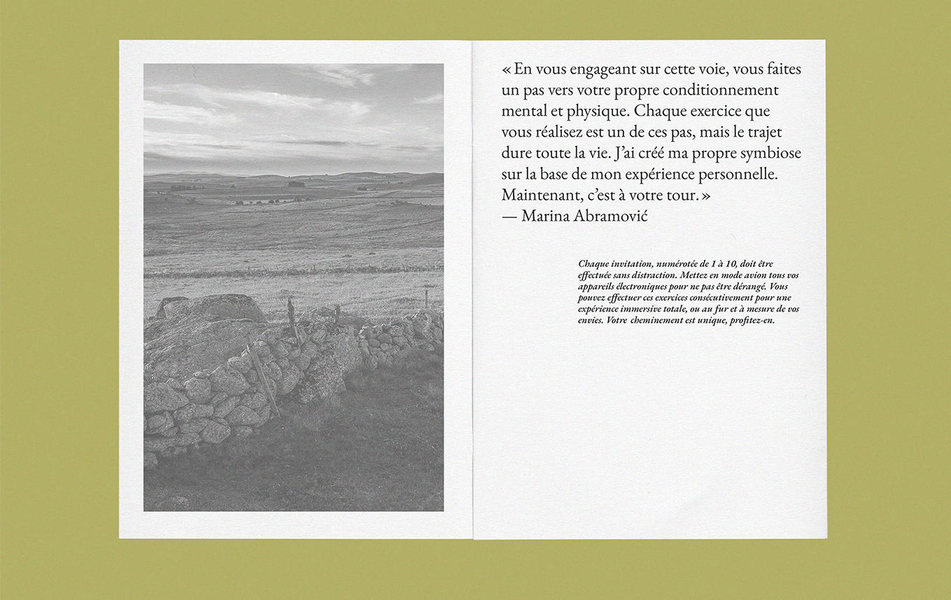 A Journey Through Aubrac is a 24-page guide printed on Munken paper, blending the raw beauty of the Aubrac region with Marina Abramović’s principles. This project is an invitation to slow down, immerse yourself in the landscape, and explore the dialogue between nature and introspection. Through ten numbered exercises, the guide encourages a deep and undistracted connection with your surroundings—an experience shaped by presence, silence, and personal discovery.