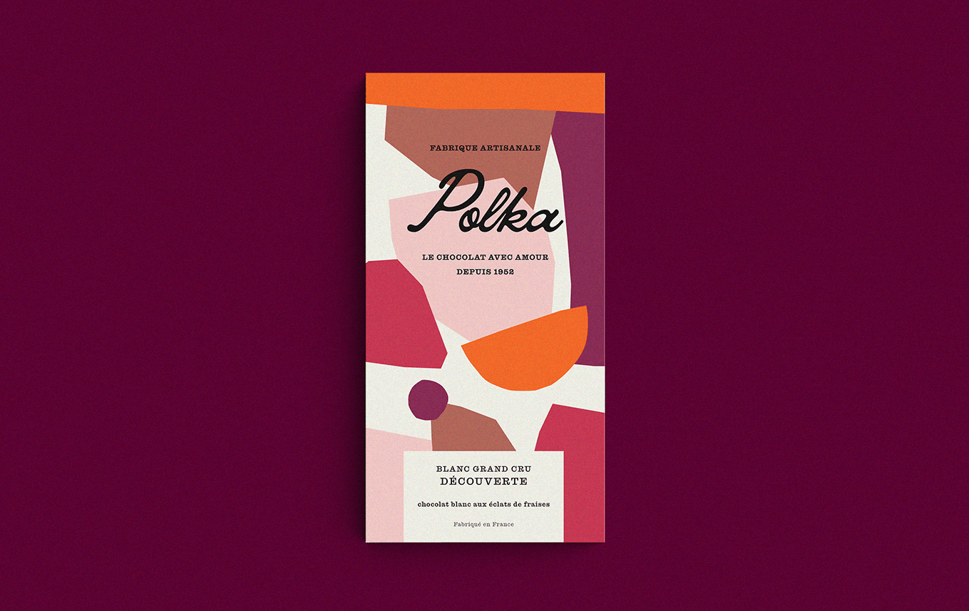 Polka is a collection of three artisanal chocolate bars designed for the holiday season. The packaging features abstract geometric shapes in warm, festive tones, blending elegance with a playful touch. Each design reflects the joy and generosity of Christmas, creating a distinctive and cohesive visual identity that makes every bar a gift in itself.